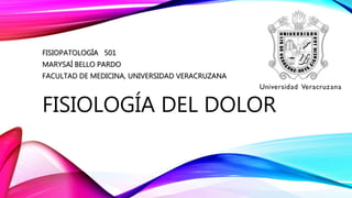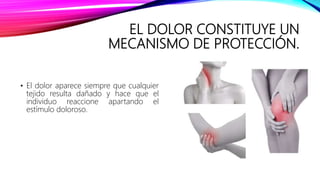 El dolor actúa como un mecanismo de protección, activándose ante el daño tisular mediante un proceso llamado nocicepción, que incluye la transducción, transmisión y modulación del dolor. Existen dos tipos principales de vías para la transmisión del dolor: la vía rápida para el dolor agudo y la vía lenta para el dolor crónico, utilizando diferentes tipos de fibras nerviosas. Además, el sistema nervioso posee mecanismos de analgesia que pueden suprimir la percepción del dolor a través de neurotransmisores como la encefalina y la sustancia P.