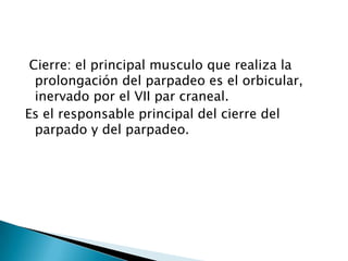 Los movimientos de los parpados incluyen la apertura y el cierre. La apertura depende de varios músculos, mientras que el cierre depende principalmente del músculo orbicular. Existen tres tipos de parpadeo: espontáneo, reflejo en respuesta a estímulos, y voluntario que requiere participación cortical. El parpadeo sirve para lubricar y proteger el ojo.