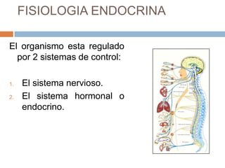 El documento describe el sistema endocrino y la fisiología de las hormonas. Explica que el sistema endocrino regula funciones orgánicas a través de hormonas secretadas por glándulas. Las hormonas pueden actuar de forma autocrina, paracrina o general en todo el cuerpo. La hipófisis y otras glándulas endocrinas secretan hormonas que controlan procesos como el crecimiento, metabolismo y reproducción.