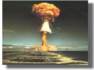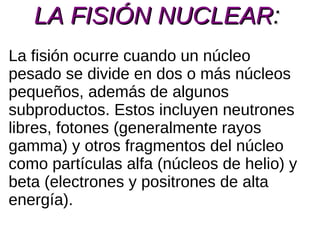 El documento describe los procesos de fisión y fusión nuclear. La fisión nuclear divide núcleos pesados en núcleos más pequeños y se usa para generar energía eléctrica en centrales nucleares y para armas atómicas. La fusión nuclear une núcleos más pequeños para formar núcleos más pesados y se usa para armas nucleares, aunque aún no se han construido reactores de fusión.
