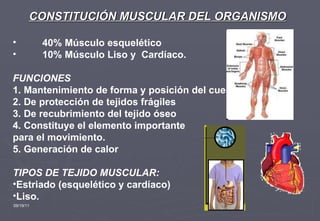 El documento describe la fisiología muscular. El 40% del cuerpo es músculo esquelético y el 10% es músculo liso y cardíaco. Existen tres tipos de tejido muscular: estriado esquelético y cardíaco, y liso. El músculo esquelético está compuesto de fascículos musculares que contienen fibras musculares multinucleadas. La contracción muscular ocurre cuando los filamentos delgados de actina se deslizan sobre los filamentos gruesos de miosina gracias a la hidrólisis de ATP