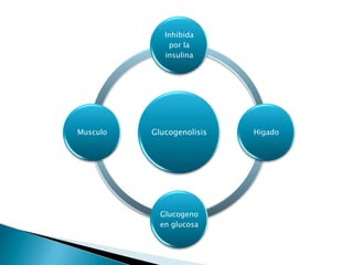 Los hepatocitos constituyen el 80% de las células del hígado y desempeñan múltiples funciones metabólicas. El hígado almacena glucógeno, gluconeogénesis y metaboliza carbohidratos, lípidos, minerales y fármacos. Las células estrelladas almacenan vitaminas y sintetizan colágeno, mientras que las células de Kupffer fagocitan partículas. El hígado desempeña un papel clave en el metabolismo a través de la