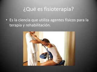 La fisioterapia utiliza agentes físicos como el frío, el calor, los masajes y el agua para la terapia y rehabilitación mediante la manipulación del cuerpo. Se aplica en campos como la terapia cardiaca, respiratoria, geriátrica, pediátrica, deportiva y animal.