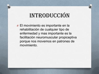 La fisioterapia consiste en ejercicios prescritos para corregir deterioros y mejorar la salud. Incluye ejercicios pasivos realizados por el terapeuta y ejercicios activos realizados voluntariamente por el paciente. Los ejercicios deben realizarse de forma regular para aumentar la fuerza muscular, mejorar el tono y combatir problemas como la hipotonía y la atrofia.