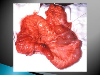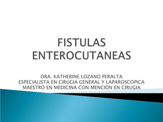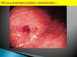 Este documento presenta información sobre la historia, etiología, clasificación, diagnóstico, tratamiento y prevención de las fístulas entero-cutáneas. Se describe el manejo inicial de estabilización y reanimación del paciente, así como las consideraciones quirúrgicas generales. También se discuten aspectos específicos sobre fístulas gástricas, duodenales, del intestino delgado e ileales.