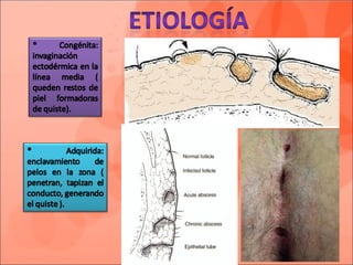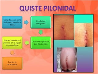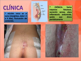 Este documento describe diferentes tipos de abscesos anorrectales, incluyendo sus manifestaciones clínicas, diagnóstico y tratamiento. Los abscesos pueden ser perianales, isquiorrectales, interesfinterianos o supraelevadores. El tratamiento depende de la ubicación y puede incluir drenaje, incisión quirúrgica o antibióticos. También se discuten las fístulas anales, su clasificación, diagnóstico y opciones de tratamiento como fistulotomía, seton o cirugía.