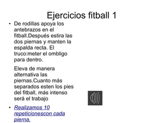 Este documento presenta 12 ejercicios diferentes utilizando un fitball (pelota de ejercicios) para trabajar diferentes partes del cuerpo. Los ejercicios incluyen movimientos para las piernas, abdominales, espalda y equilibrio sentado sobre el fitball. Cada ejercicio especifica el número de repeticiones recomendadas.