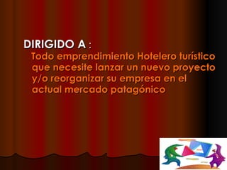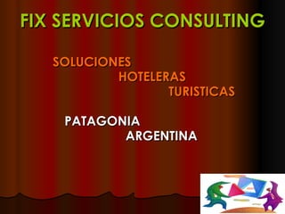 Fix Servicios Consulting ofrece soluciones de consultoría para empresas hoteleras y turísticas en la Patagonia Argentina, incluyendo la implementación de sistemas estructurales, capacitación a empleados, y diagnósticos de satisfacción de clientes. La consultora busca profesionalizar los recursos humanos, crear un ambiente laboral adecuado, y optimizar procesos mediante métodos estandarizados para mejorar resultados y satisfacción de clientes.