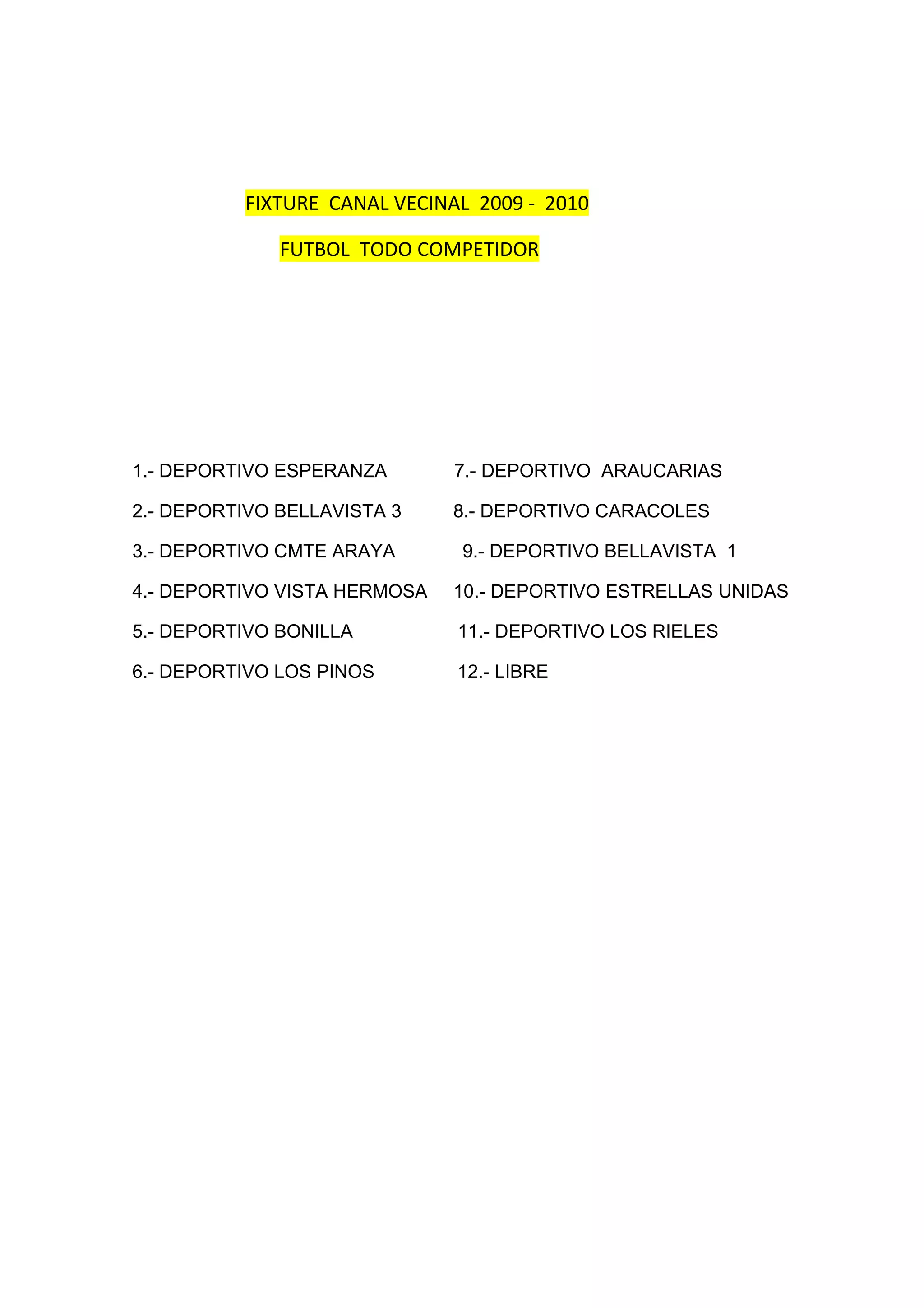Este documento presenta el fixture de 11 fechas para un torneo de fútbol entre 12 equipos: Esperanza, Bella Vista 3, Comandante Araya, Vista Hermosa, Bonilla, Los Pinos, Araucarias, Caracoles, Bella Vista 1, Estrellas Unidas, Los Rieles y un equipo libre. Se detallan los resultados de los partidos jugados en cada fecha, con los goles a favor y en contra de cada equipo.