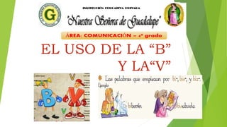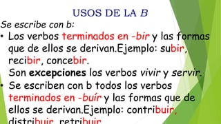 Este documento describe los usos de las letras "b" y "v" en español. Explica que la "b" se usa en verbos terminados en -bir, -buir, beber, caber, deber, saber, haber, sorber y sus formas derivadas. También se usa en prefijos bi- y bis- y palabras terminadas en -bundo, -bunda, -bilidad. La "v" se usa en verbos terminados en -servar, -versar, y las formas de estar, andar y tener. También se usa en palabras termin
