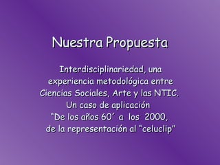 El documento propone un proyecto interdisciplinario entre Ciencias Sociales, Arte y Tecnologías de la Información y la Comunicación (TIC) para estudiantes de dos escuelas secundarias en Buenos Aires y Montevideo. El proyecto busca mejorar los procesos de enseñanza y aprendizaje a través de un enfoque interdisciplinario y el uso de las TIC para integrar diferentes áreas de conocimiento, capacitar docentes y que los estudiantes se apropien de las herramientas tecnológicas. Se implementaría en seis
