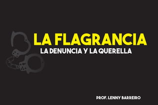 El documento habla sobre la denuncia, la querella y la flagrancia en el contexto legal. Explica que una denuncia es cuando alguien informa sobre un delito que presenció o del que tiene conocimiento, mientras que una querella es cuando la víctima acusa directamente al ofensor. También cubre que la flagrancia se refiere a cuando alguien es atrapado cometiendo un delito.