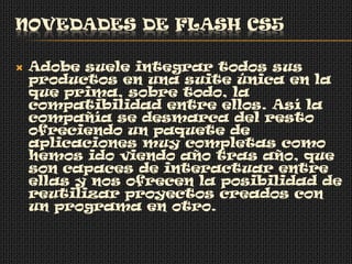 Este documento proporciona una introducción a Flash Professional CS5. Explica que Flash es una potente herramienta creada por Adobe para realizar animaciones y diseños interactivos para la web. Flash es fácil de aprender y tiene un entorno de trabajo intuitivo. Flash CS5 también cuenta con características como la compatibilidad entre los productos de Adobe y la capacidad de reutilizar proyectos entre programas.