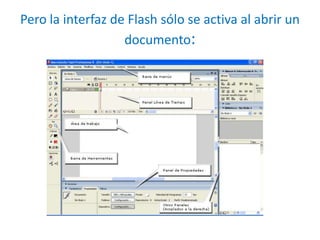 Este documento describe la interfaz principal de Adobe Flash. Incluye una ventana de bienvenida al iniciar el programa y una barra de menús superior con opciones como Archivo, Edición e Insertar. También describe el panel de herramientas que contiene herramientas para dibujar y modificar elementos, y barras de herramientas adicionales como la barra principal, de edición y controlador.