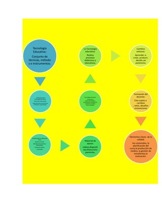 La tecnología educativa implica el uso de técnicas, métodos e instrumentos para realizar procesos didácticos y educativos. Se desarrolla en áreas como el diseño curricular, los métodos de enseñanza-aprendizaje y los planes de estudio. Un elemento clave es el material de apoyo como videos y diapositivas, y la formación del docente debe estar sujeta a cambios e innovaciones.