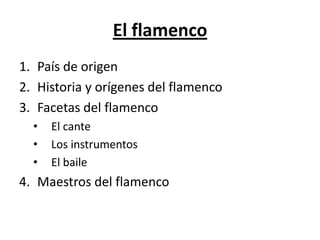 El documento describe el flamenco, un arte que nació en Andalucía, España, de la fusión de culturas árabes, judías e hindúes. El flamenco tiene tres facetas principales: el cante o canto, los instrumentos como la guitarra española, y el baile. El documento también menciona algunos de los maestros más importantes del flamenco como Camarón de la Isla y Paco de Lucía.