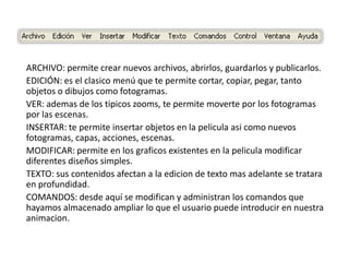 El documento describe los elementos principales de la interfaz de usuario de Adobe Flash, incluyendo las barras de menús y herramientas, la línea de tiempo, el escenario de trabajo y ventanas acoplables. Identifica y explica brevemente las funciones de cada elemento para controlar y crear animaciones en Flash.