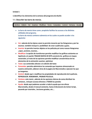 Este documento describe los elementos principales de la interfaz de usuario de un programa de diseño. Identifica la barra de menús, las barras de herramientas, las ventanas acoplables como el panel de color y la línea de tiempo. Explica las funciones básicas de estas herramientas y cómo facilitan la edición y configuración del área de trabajo y la animación.