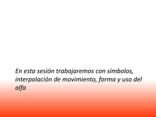 Este documento presenta varios proyectos de animación en Adobe Flash que involucran el uso de símbolos, interpolación de movimiento, forma y alfa. Los proyectos incluyen la animación de autos en movimiento, una pelota rebotando, animación de letras y una ventana emergente con transparencia cambiante. También proporciona ejercicios propuestos para aplicar estas técnicas a la animación de una hélice, aviones y publicidad.