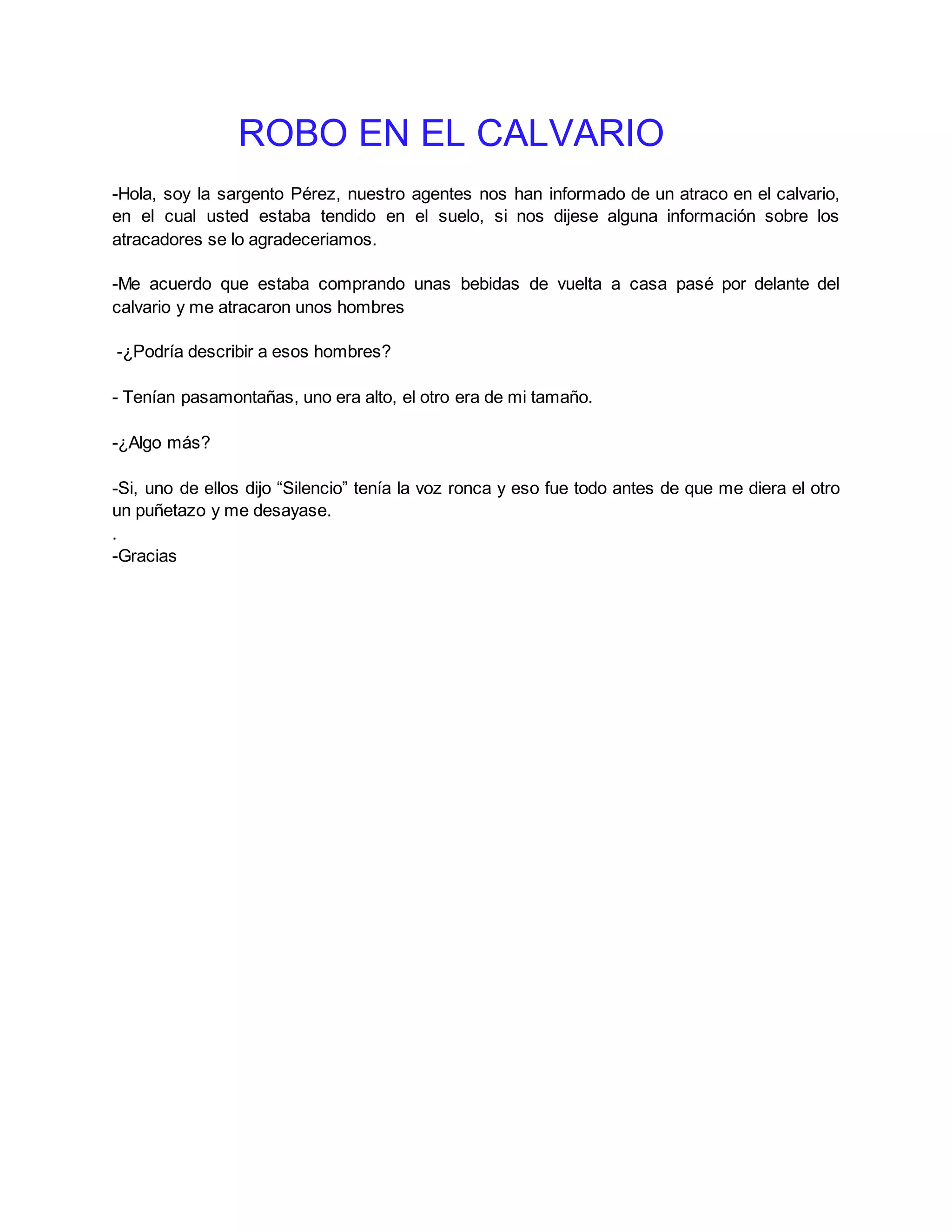 Un hombre fue asaltado en el Calvario por dos hombres enmascarados. Uno de los atracadores era alto y el otro era del mismo tamaño que la víctima. Uno de los atracadores, que tenía una voz ronca, le dijo a la víctima "Silencio" antes de que el otro lo golpeara y lo dejara inconsciente. La víctima proporcionó esta información a la sargento Pérez para ayudar a identificar a los atracadores.