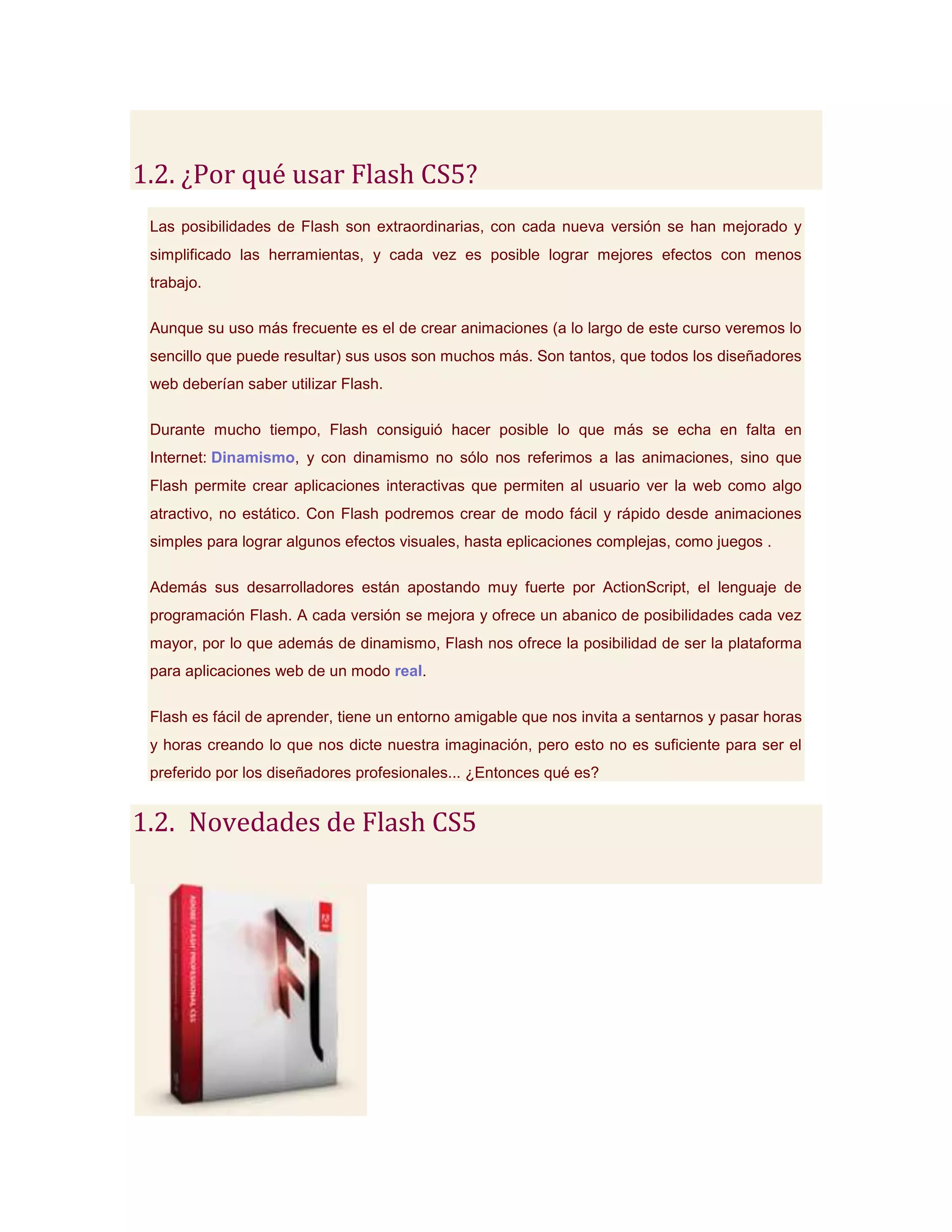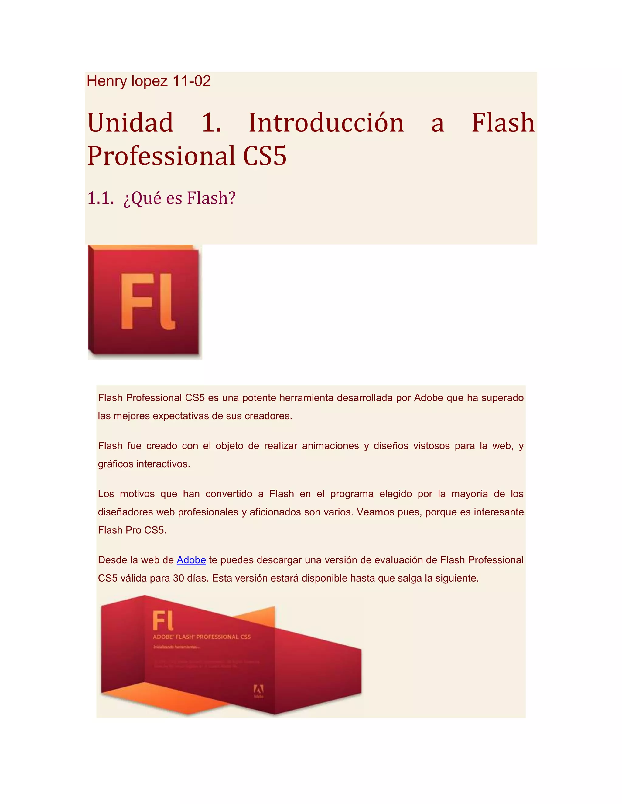 Este documento introduce Flash Professional CS5, describiendo qué es Flash, sus ventajas para el diseño web interactivo y dinámico, y las novedades y mejoras de la versión CS5. También resume las ventajas e inconvenientes de usar Flash en las páginas web, y explica cómo crear una animación básica de una pelota botando en Flash.