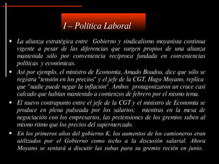 El documento analiza la tensa relación entre el gobierno argentino y los sindicatos, destacando las negociaciones salariales en un contexto de alta inflación. También menciona la implementación de medidas que benefician a las obras sociales sindicales y la regulación del teletrabajo. Finalmente, se reporta un ligero aumento en el empleo total, con una disminución en la contratación de ejecutivos y un ajuste salarial promedio para los ejecutivos del 19,49%.
