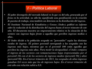 El documento analiza la situación laboral y salarial en Argentina. Muestra que la desigualdad en los ingresos ha empeorado, con los sectores de menores ingresos ganando menos en relación a los ingresos medios y altos. También discute la postura de los sindicatos de rechazar límites salariales por debajo de la inflación y exigir una solución al impuesto a las ganancias. Por último, presenta noticias breves sobre empresas como Danone y Citroën.