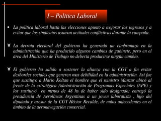 El documento analiza la situación laboral en Argentina tras la derrota electoral del gobierno en 2009, señalando un aumento en la pobreza y una disminución del empleo formal. A nivel gremial, se destaca la inestabilidad de la CGT y la búsqueda de un nuevo piso salarial, mientras que la Asociación Empresaria Argentina critica las políticas gubernamentales y aboga por un entorno económico más favorable. Mercer presenta una encuesta global que revela la tendencia de muchas empresas a ajustar sus compensaciones sin grandes recortes de personal.