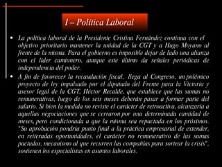 La política laboral del gobierno de Cristina Fernández busca mantener la unidad sindical y presenta un proyecto de ley para incluir sumas no remunerativas en el salario. A pesar de la crisis económica, se han realizado aumentos salariales del 18% y se han registrado conflictos laborales, siendo los docentes y trabajadores públicos los más afectados. Las expectativas de empleo para el cuarto trimestre de 2009 son positivas, con un 12% de empresas planeando contrataciones, aunque las empresas han reducido su personal en el último año.