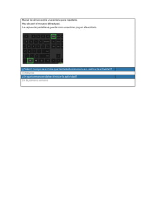 El documento describe una práctica en Adobe Flash CS6 que involucra la creación de un nuevo archivo y la captura de pantalla del archivo nuevo. Los estudiantes tienen 5 minutos para completar la actividad y deben enviar un pantallazo del archivo nuevo por correo electrónico para su evaluación en la primera semana.