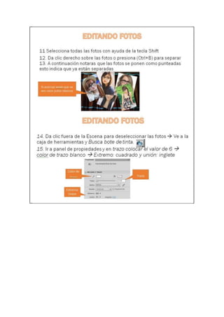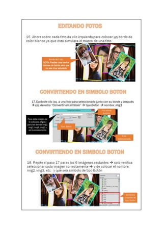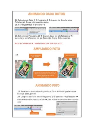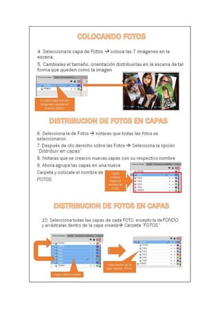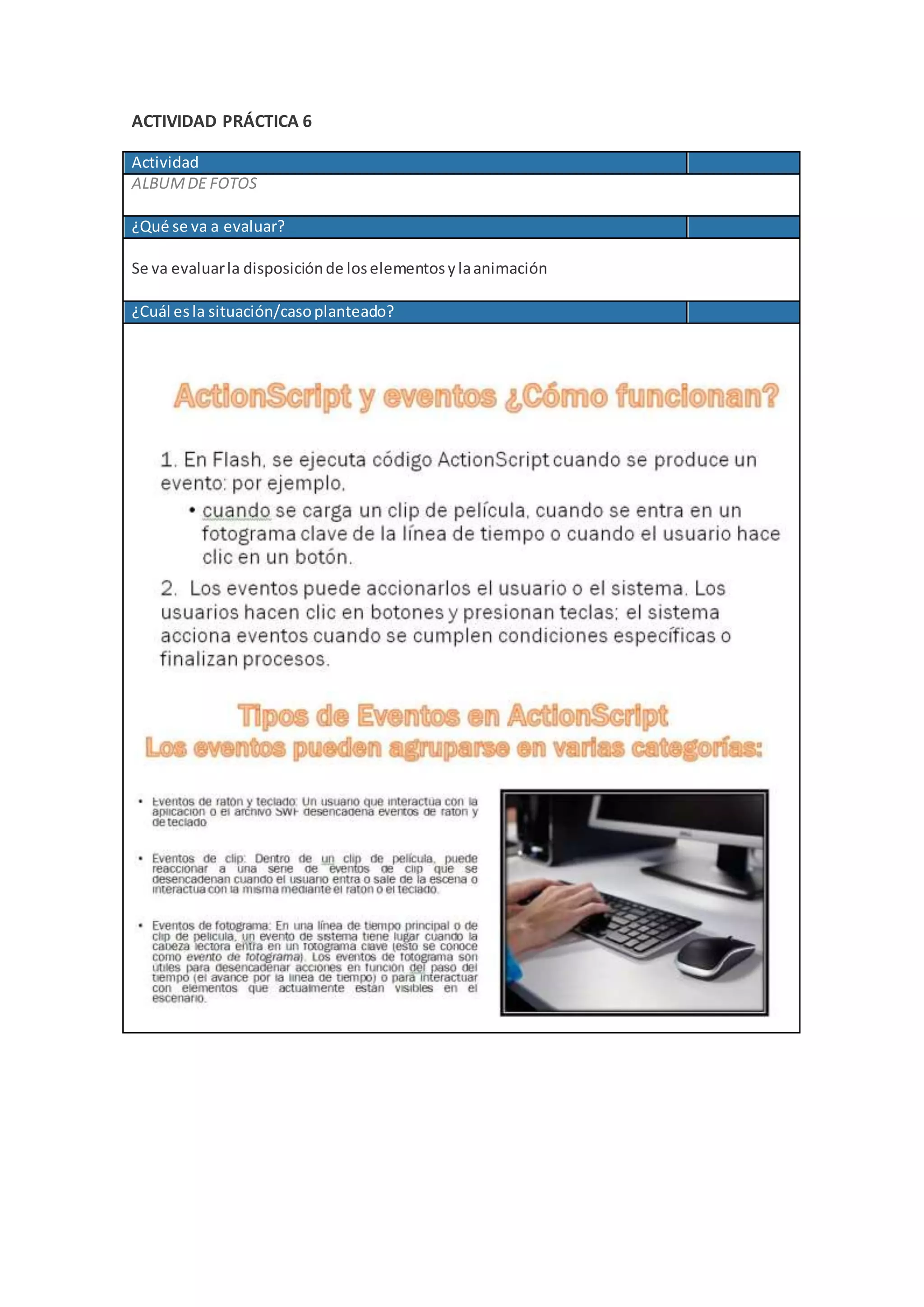 Este documento presenta una actividad práctica para crear un álbum de fotos en el que se evaluará la disposición de los elementos y la animación. Se estima que la actividad llevará de 2 a 3 horas y deberá iniciarse en la primera semana. El documento también incluye enlaces a recursos adicionales para completar la tarea.