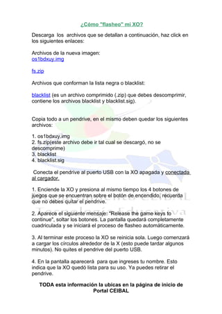 El documento describe cuando se recomienda flashear una computadora XO y los pasos para realizar el proceso de flasheo. Se recomienda flashear la XO en casos como cuando no aparece el ícono de la actividad diaria, hay errores al iniciar, o para actualizar a la última versión del sistema. El proceso de flasheo involucra copiar archivos de imagen e información de blacklist a un pendrive USB, presionar botones al encender la XO para iniciar el flasheo, y reiniciar la máquina para