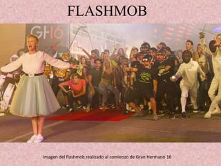 Un flashmob es una acción organizada en la que un gran grupo de personas se reúne de repente en un lugar público, realiza algo inusual como bailar o cantar, y luego se dispersa rápidamente. Un flashmob se puede organizar eligiendo una canción, encontrando un coreógrafo, escogiendo un lugar, reuniendo bailarines, enseñándoles la coreografía, y eligiendo un líder. Aunque suelen ser para entretenimiento, también pueden tener fines políticos o de reivindicación. La clase planea realizar un flashmob con música de diferentes
