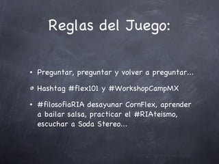Este documento presenta la agenda para un taller sobre Flex 101. La agenda incluye introducciones a conceptos básicos de Flex como componentes, eventos, estados y efectos. También cubre temas como datos, renderizadores, AIR y recursos para aprender más sobre Flex. El taller es impartido por Edgar Parada, instructor certificado de Adobe de varias compañías.