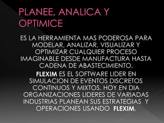 Flexim es un software líder para simulación de eventos discretos, continuos y mixtos que permite modelar, analizar, visualizar y optimizar procesos de manufactura y cadena de suministro. Flexim es utilizado por organizaciones líderes en diversas industrias para planificar estrategias y operaciones. El software ofrece precisión en resultados y estadísticas, construyendo modelos directamente en 3D e importando y exportando datos.