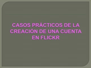 El documento presenta Flickr, un sitio web que permite almacenar, ordenar, buscar, vender y compartir fotografías y videos. Actualmente tiene 1.5 millones de usuarios y 60 millones de fotos públicas. Ofrece funcionalidades como búsqueda por etiquetas, fecha y licencias Creative Commons. Las empresas pueden usar Flickr para gestionar conocimiento, crear comunidades y realizar marketing mediante la publicación de imágenes.