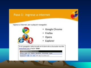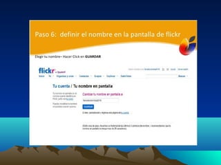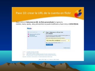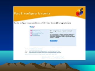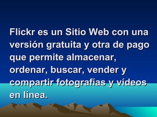 Flickr es un sitio web que permite almacenar, organizar, buscar, vender y compartir fotografías y videos de manera gratuita o paga. Las imágenes se pueden subir desde teléfonos móviles, correo electrónico, la página web de Flickr o aplicaciones de escritorio y de terceros como Aperture, Picasa y Windows Live Gallery. Flickr se puede utilizar para hacer textos con fotografías, grupos colaborativos, generar diálogo educativo sobre imágenes, organizar álbumes familiares y sens