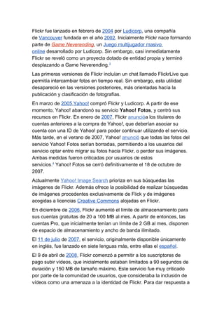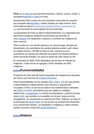 Flickr es un sitio web que permite a los usuarios almacenar, organizar, buscar, compartir y vender fotografías y videos. Los usuarios pueden etiquetar sus imágenes y explorar y comentar las imágenes de otros. Flickr ofrece cuentas gratuitas con un límite mensual de almacenamiento y cuentas de pago con almacenamiento ilimitado. La popularidad de Flickr se debe a sus herramientas para administrar imágenes y a su gran comunidad de usuarios que comparten contenido.