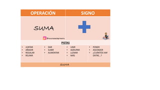 Este documento presenta las operaciones matemáticas básicas (suma, resta, multiplicación y división), junto con pistas verbales clave para identificar cada operación y sus signos correspondientes. Para la suma se proporcionan palabras como "juntar" y "más", para la resta se usan "quitar" y "menos", para la multiplicación se usan "repetir" y "doble", y para la división se usan "partir" y "mitad".