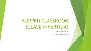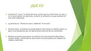 El documento describe el método de enseñanza conocido como "clase invertida" o "flipped classroom". Este método consiste en que los estudiantes realizan la parte teórica de la asignatura en casa a través de videos u otros recursos digitales, mientras que las actividades prácticas y la resolución de dudas se llevan a cabo en el aula con la guía del profesor. Los fundadores de este método fueron Bergmann y Sams, quienes grabaron presentaciones para que los estudiantes las vieran en casa. El documento también