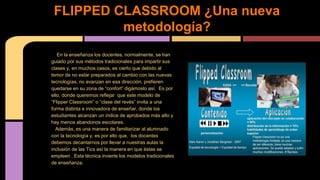 Este documento describe el modelo de "aula invertida" o "clase invertida", en el que los estudiantes ven material de video sobre los contenidos fuera de clase y realizan actividades y trabajos en grupo durante la clase con la guía del profesor. El modelo invierte los métodos tradicionales al trasladar la instrucción inicial a casa y usar la clase para profundizar el aprendizaje de manera colaborativa. El documento argumenta que este enfoque lleva a índices más altos de éxito estudiantil y menor abandono escolar,