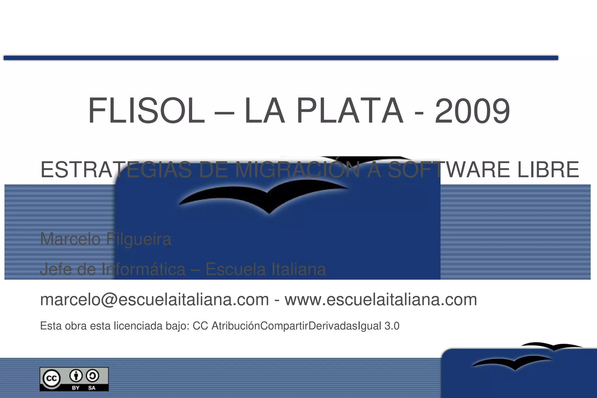 ![FLISOL – LA PLATA - 2009 ESTRATEGIAS DE MIGRACIÓN A SOFTWARE LIBRE Marcelo Filgueira Jefe de Informática – Escuela Italiana [email_address] - www.escuelaitaliana.com Esta obra esta licenciada bajo: CC AtribuciónCompartirDerivadasIgual 3.0](https://image.slidesharecdn.com/flisol2009floss-091113083421-phpapp02/75/Flisol2009-Floss-1-2048.jpg)