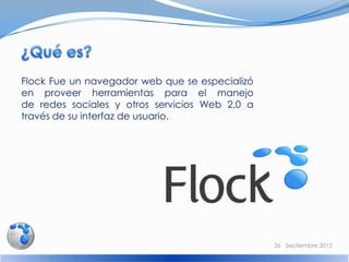 Flock fue un navegador web que se especializó en integrar redes sociales y servicios multimedia como Facebook, YouTube y Twitter a través de su interfaz. El navegador estaba disponible de forma gratuita para Windows, Mac y Linux y permitía actualizaciones en múltiples redes sociales de forma simultánea. En 2011, Flock fue adquirido por Zynga y descontinuado, recomendándose a los usuarios migrar a Chrome o Firefox.