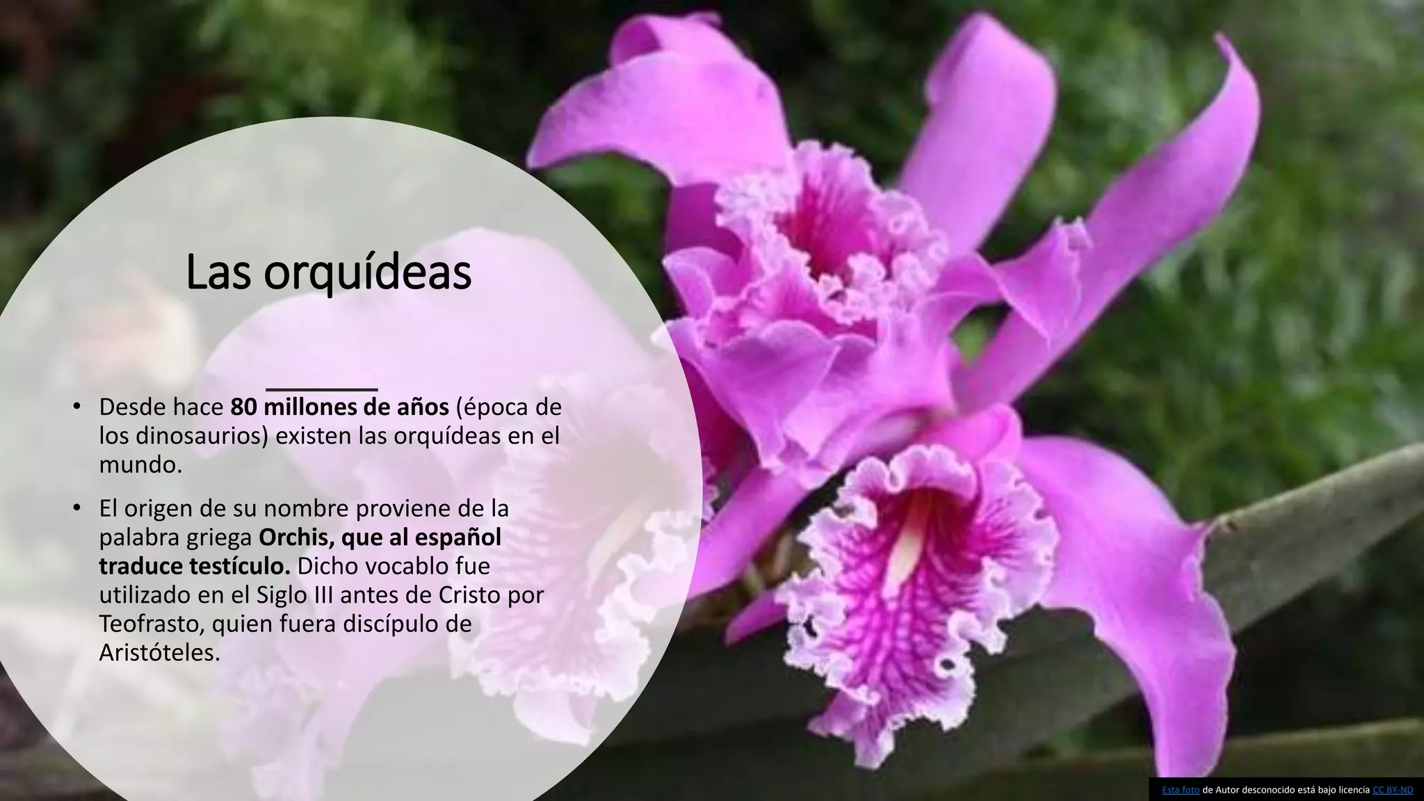 Las orquídeas existen desde hace 80 millones de años y su nombre proviene del griego 'orchis', que significa testículo. En Colombia, hay 4.270 especies registradas y la 'cattleya trianae' fue designada como flor nacional en 1936 por su belleza. Estas plantas crecen en climas tropicales, a menudo sobre ramas de árboles, y requieren luz, humedad y un hongo para la germinación de sus semillas.