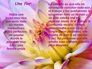 Una mujer rica tenía todo lo que podía desear, pero estaba tan ocupada con el trabajo y las responsabilidades que descuidaba a su familia. Su padre sabio le dio una flor única y le dijo que la cuidara, pero ella también la descuidó y la flor murió. Su padre le explicó que su familia, al igual que la flor, necesitaba de su atención y cuidado para no marchitarse.
