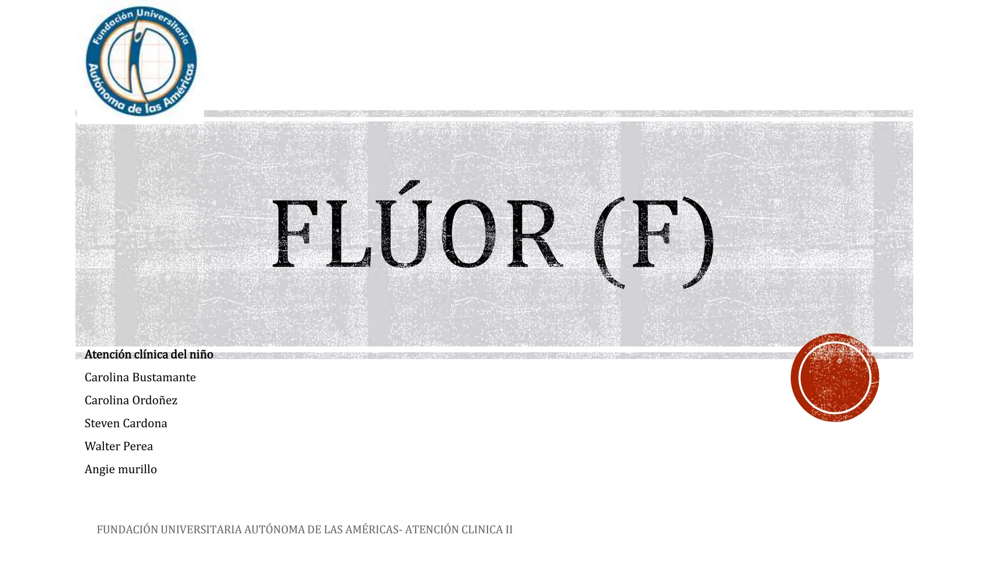 El documento trata sobre el flúor y su importancia en la salud bucal. Describe las propiedades químicas del flúor, sus mecanismos de acción en los dientes, formas de aplicación tópica y sistémica, y efectos adversos como la fluorosis dental. También aborda temas como la dosificación adecuada según la edad y las guías para programas de fluorización en niños.