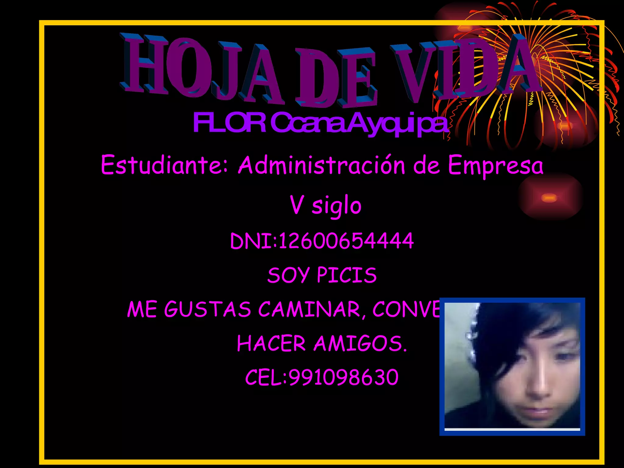 Este documento presenta una hoja de vida de una estudiante de administración de empresa. Presenta información sobre su familia, a la que quiere mucho, especialmente a su prima Evelyn. También habla de su centro de estudio, que considera agradable y donde pasa la mayor parte de su tiempo. Finalmente, presenta a algunos amigos cercanos y a su vecindario, aunque algunos vecinos no son muy amables.