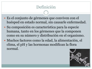 La flora normal del cuerpo humano incluye bacterias, hongos y otros microorganismos que viven en el cuerpo sin causar enfermedades. Estos microorganismos varían según la ubicación en el cuerpo y cumplen funciones importantes como desarrollar la inmunidad, prevenir la colonización de patógenos y ayudar a la digestión. Algunos de los sitios colonizados incluyen la piel, el tracto gastrointestinal y la vagina, mientras que otros como el sistema circulatorio permanecen estériles.