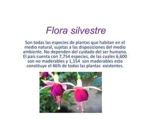 El documento describe la flora silvestre de Guatemala, incluyendo que cuenta con 7,754 especies de plantas, de las cuales algunas como el pinabete están en peligro de extinción debido a factores como la deforestación y la expansión agrícola. Además, explica que la flora se refiere al conjunto de especies vegetales nativas de una región, mientras que la vegetación también considera la distribución y abundancia de las especies. Finalmente, señala que Guatemala tiene una vegetación muy rica debido a su fertilidad.