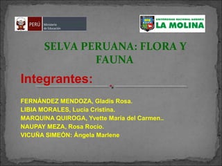 Este documento presenta información sobre varias especies de flora y fauna de la selva peruana, incluyendo plantas como la uña de gato, sacha inchi y bromelia, así como animales como el frailecillo, huapo colorado, jaguar y tortuga charapa. Describe los nombres comunes y científicos de cada especie y explica brevemente su nicho ecológico en el ecosistema de la selva.